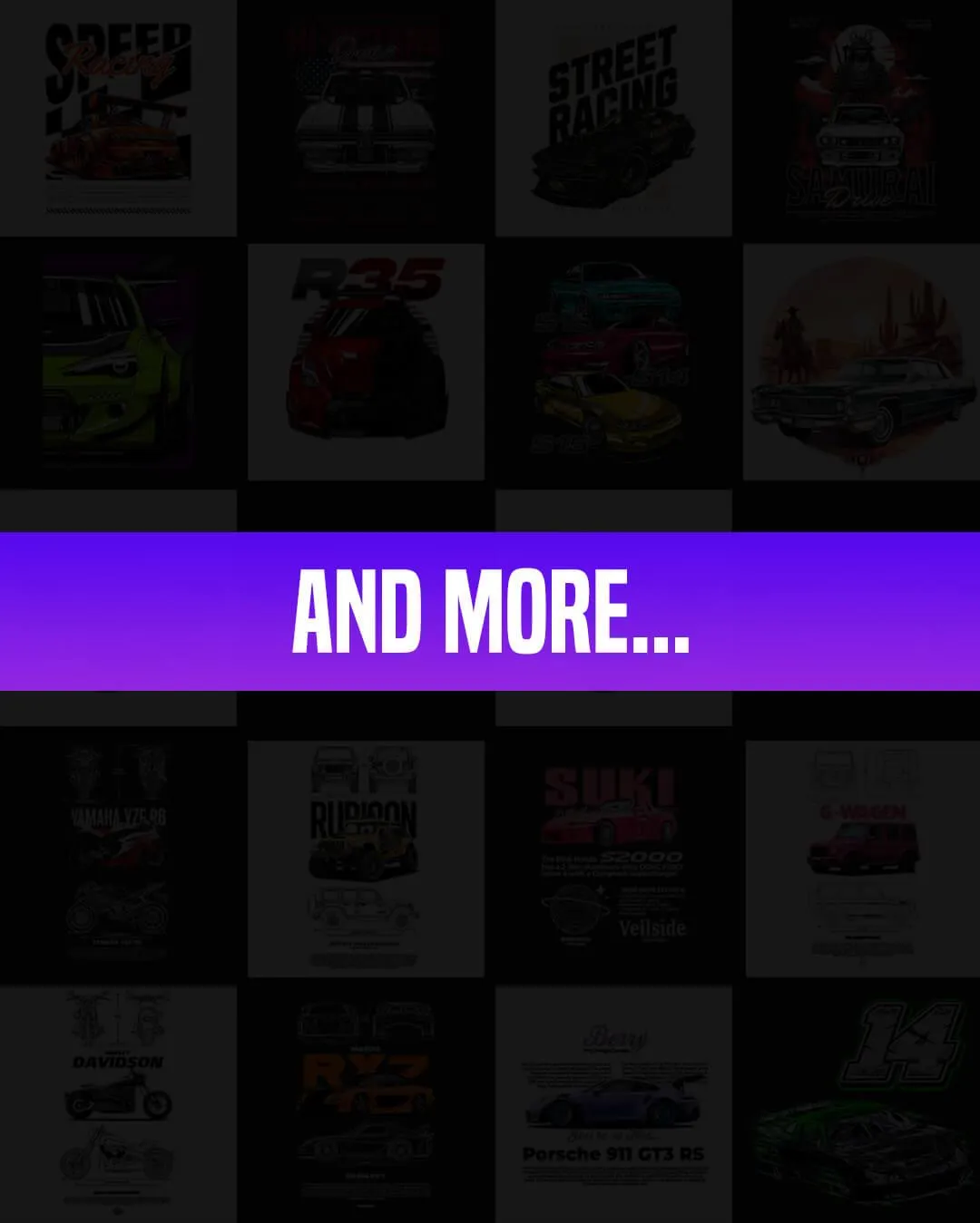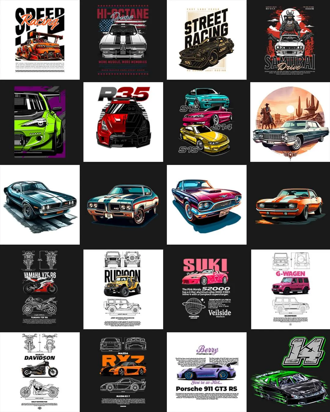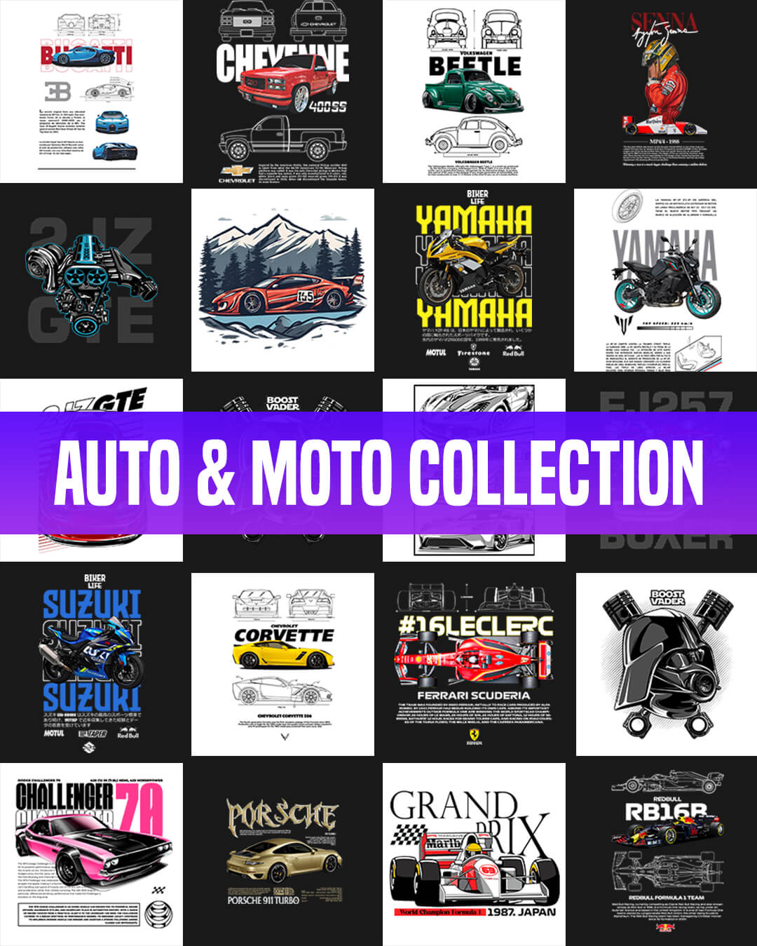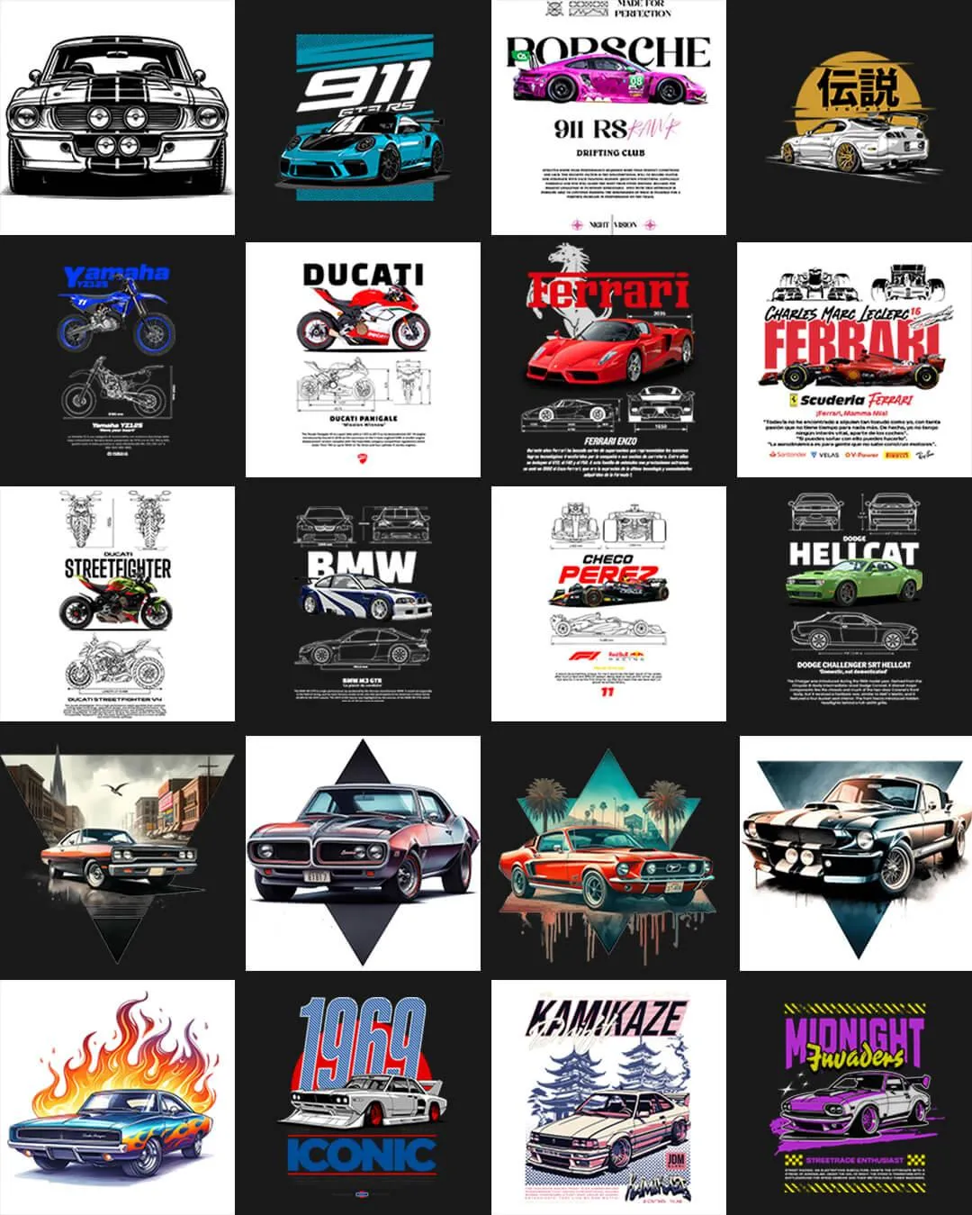 Whether you’re targeting classic car collectors, motorcycle fanatics, or street racing communities — the Auto & Moto Designs Collection gives you 800+ bold, ready-to-use graphics engineered for standout POD apparel.